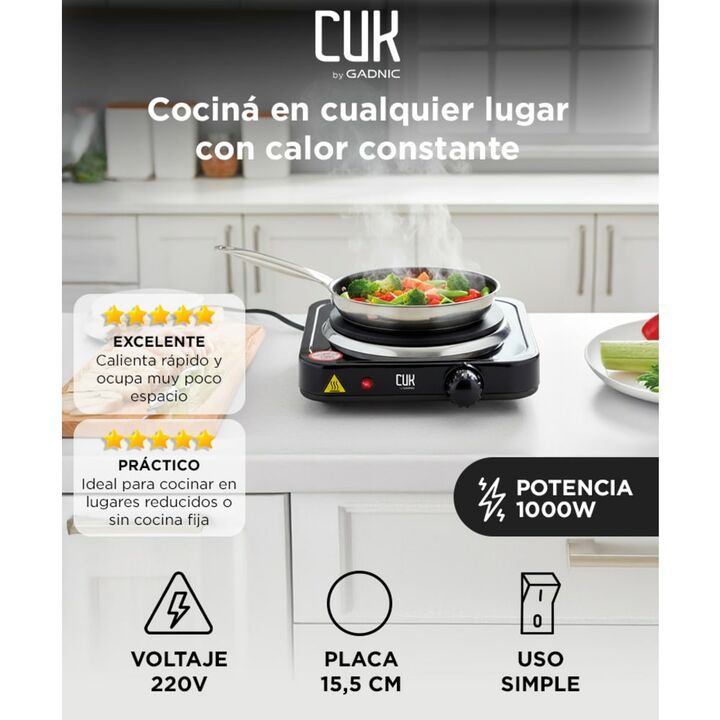 Calor constante y eficiente: Disfrutá una cocción pareja gracias a sus 1000W, ideal para uso diario y espacios reducidos. Placa universal de 15,5 cm: Compatible con la mayoría de ollas y sartenes. Prepará tus comidas sin cambiar utensilios. Diseño portátil y compacto: Llevá tu anafe donde lo necesit...