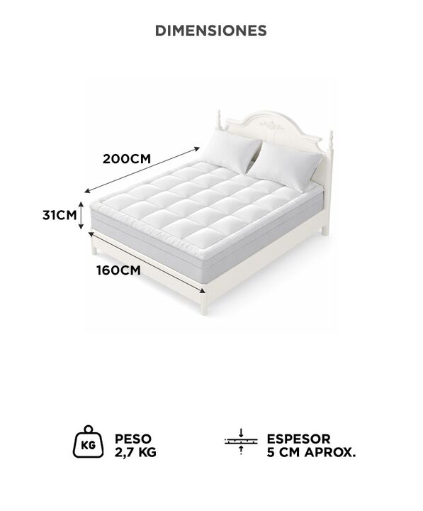 CONFORT EXTRA PARA COLCHON QUEEN Este cubre colchon acolchado tipo pillow top agrega una capa adicional de suavidad. Su espesor aproximado de 5cm mejora la sensacion general al recostarse. Es una solucion practica para renovar colchones firmes o con desgaste. Permite optimizar el descanso sin cambia...