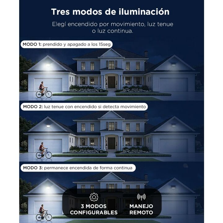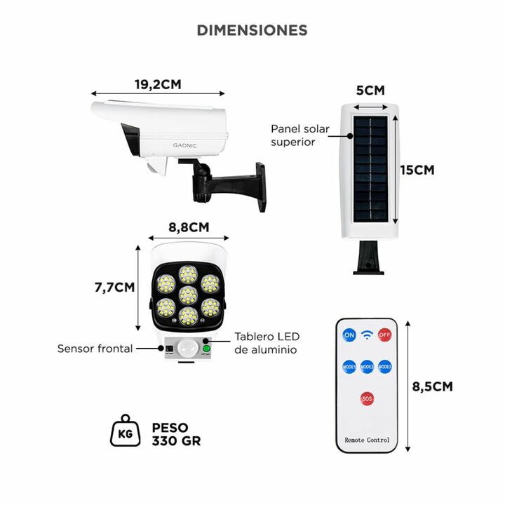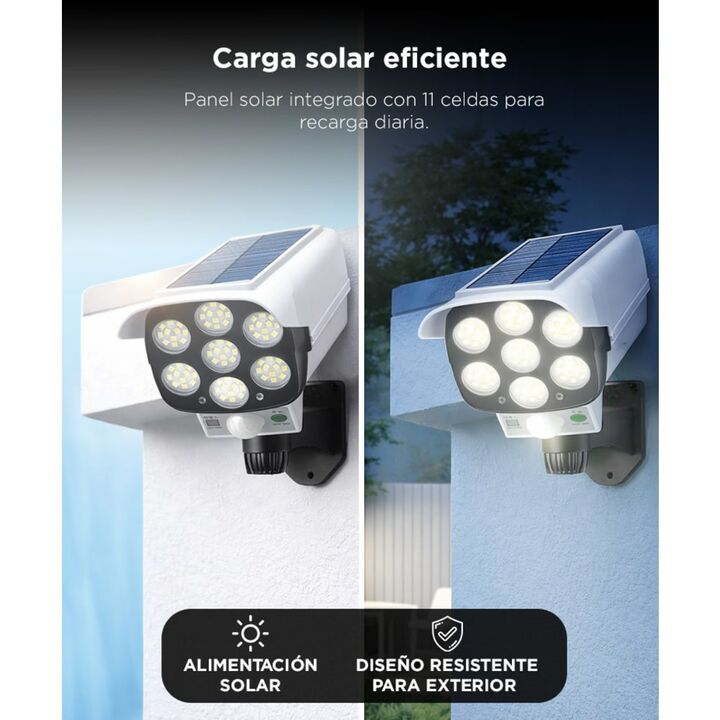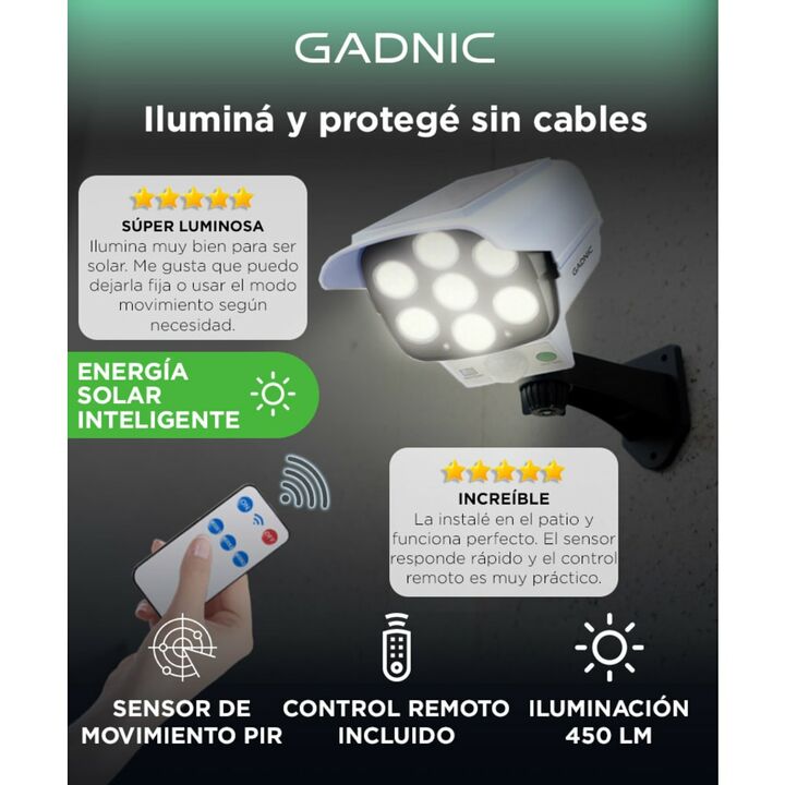 Iluminación potente sin consumo eléctrico El Reflector Luz Solar GADNIC LUZ03 de pared con control genera hasta 450 lm de luz fría con 77 LEDs SMD2835, proporcionando una iluminación clara y eficaz para entradas, jardines, garajes o espacios exteriores. Gracias a su alimentación 100 % solar, no requ...