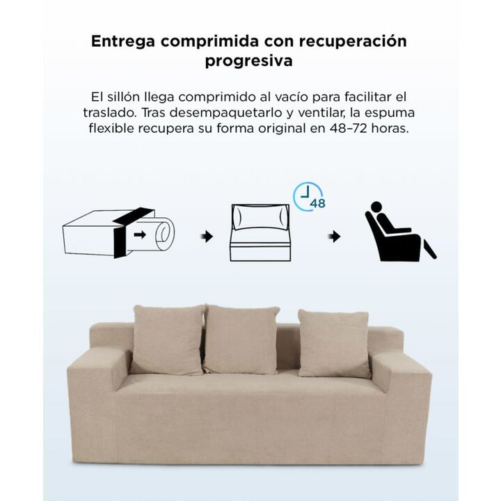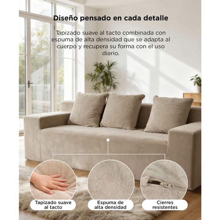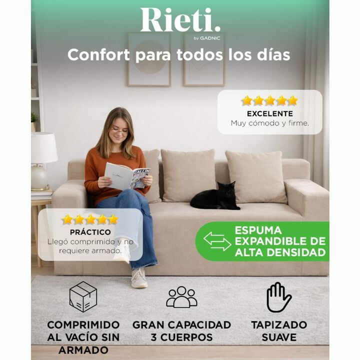 Confort mullido con espuma de alta densidad: El sillón sofá 3 cuerpos Rieti by Gadnic incorpora espuma expandible que recupera su forma con el uso, brindando una sensación cómoda y envolvente para el descanso diario. Formato 3 cuerpos con asiento profundo: Sus dimensiones reales permiten que tres pe...